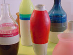 zijn haar vazen waarbij porselein en glas met tape aan elkaar zijn geplakt.