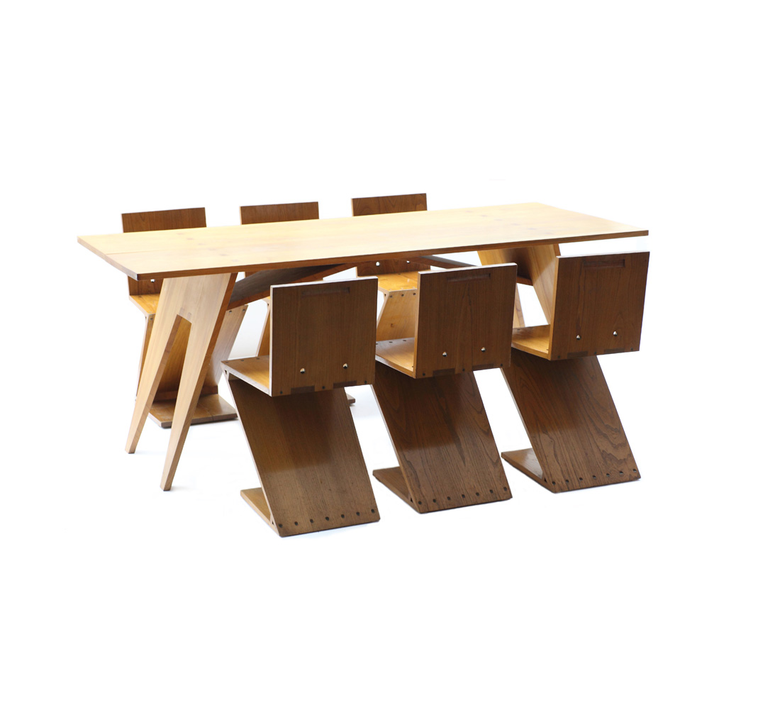 Gerrit Th. Rietveld. ZigZag table with 6 ZigZag chairs (set) from grandson Rietveld, c. 1960, photo: Galerie VIVID